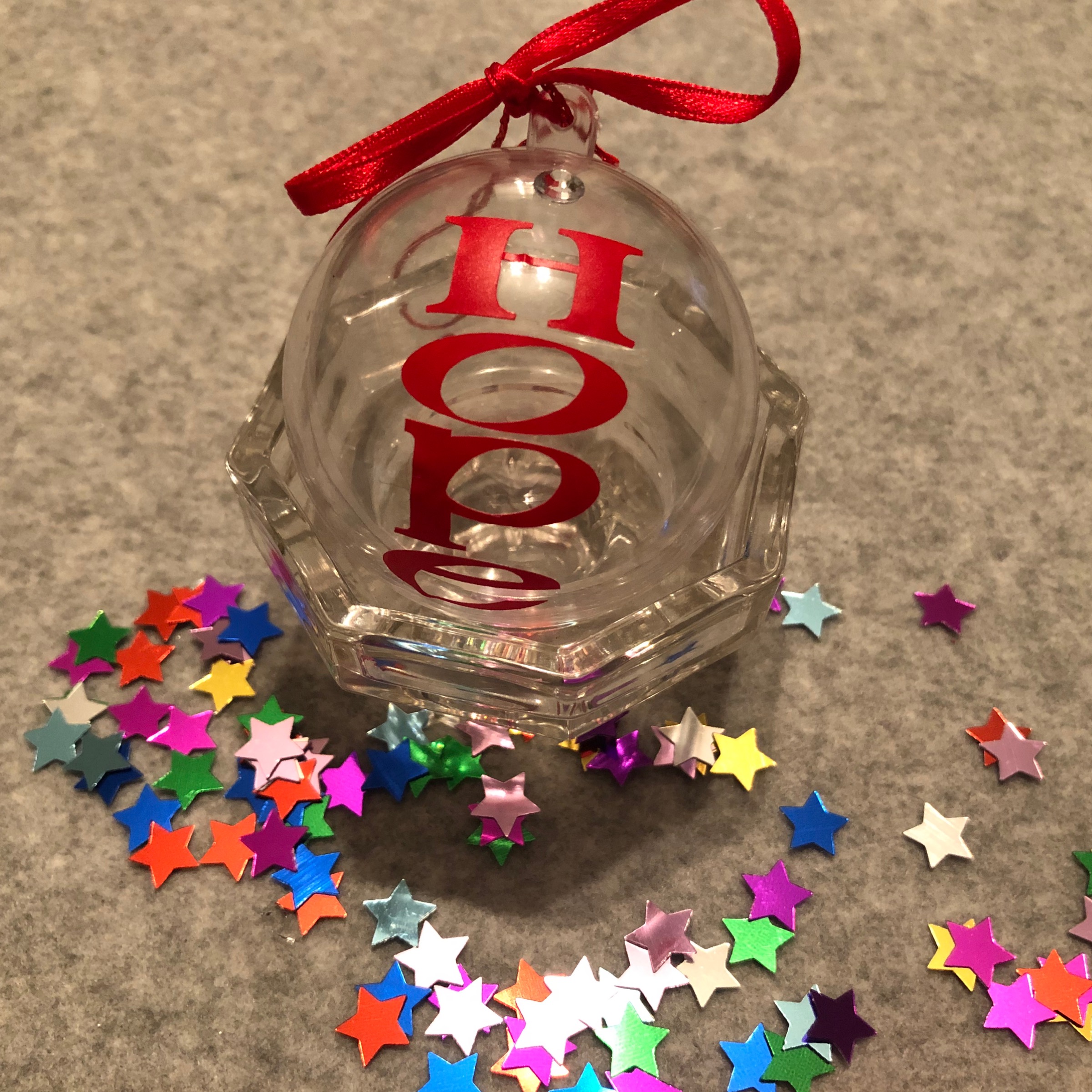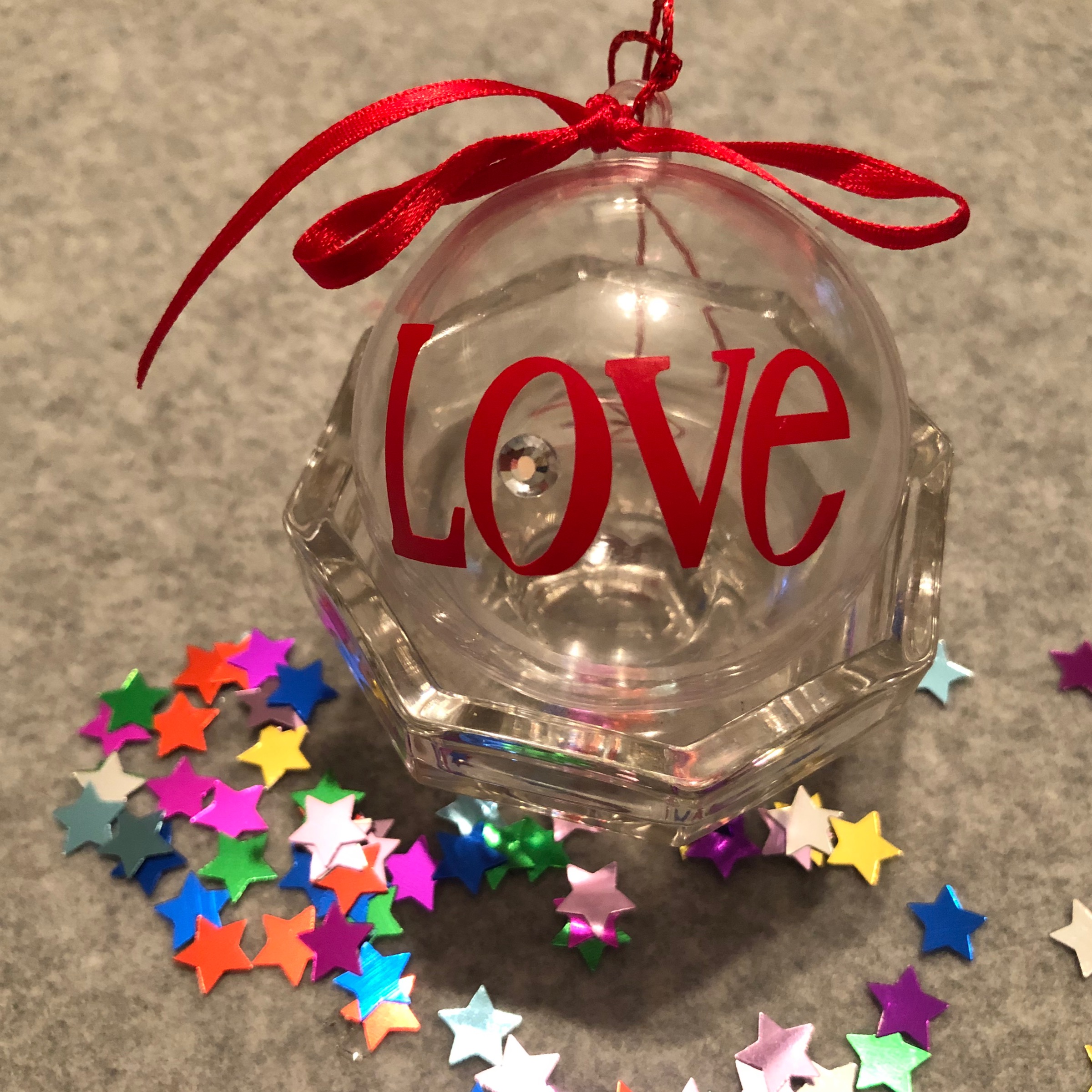 Personalised transparent plastic fillable bauble. 6cm size.